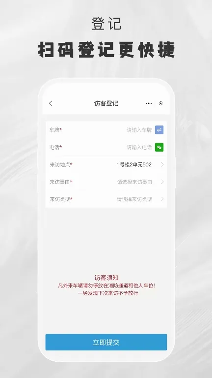 支持多种便捷的访客信息登记途径,如手动输入、扫描二维码、身份证识别等,满足不同场景下的需求,简化了登记步骤,提高了信息录入速度。