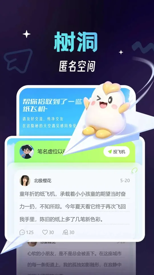 树洞聊天:设立匿名树洞空间,用户可以在其中自由发言,分享个人故事或心情,无需担心身份暴露,享受无拘无束的交流环境。