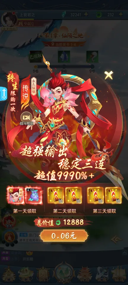 神将助力:首充0.06元即可获得强大的传说神将哪吒,他将在你的修仙旅程中为你提供强有力的支援。