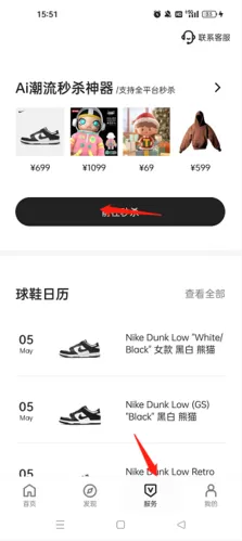 1、打开软件,点击底端的“服务”选项,然后点击“前往秒杀”选项。