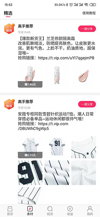 2、然后你会看到5个板块分别为首页、素材,找货、收收益、我的,点开首页这里有大量的商品供用户选择及分享:
