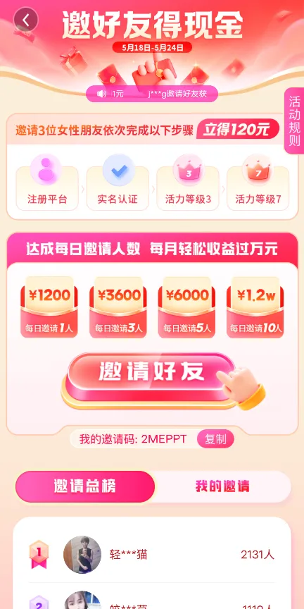 3.邀请女性朋友注册可获得1元奖励,被邀请人完成了实名认证奖励7元,好友活力等级达到3级可获得10元奖励,达到7级可再获得23元奖励