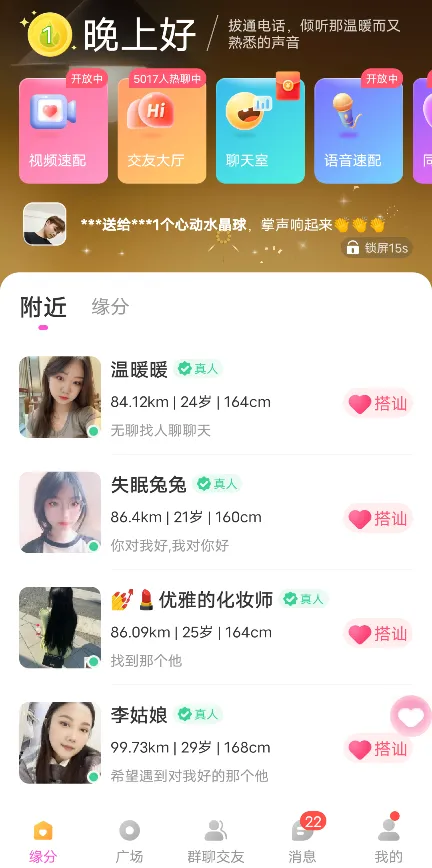 2、附近的人:通过智能定位技术,帮助用户发现并联系附近的异性朋友。