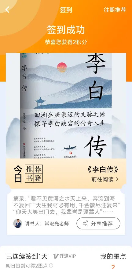 积分系统—墨点: 用户通过签到、阅读书籍、点击广告等行为可以获得积分——即“墨点”。墨点作为用户在平台上的贡献度象征,可用于参与平台收益的分配。